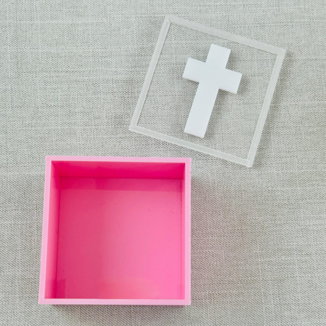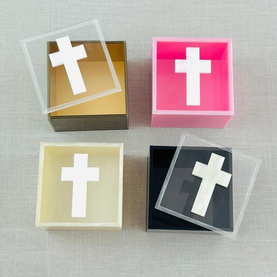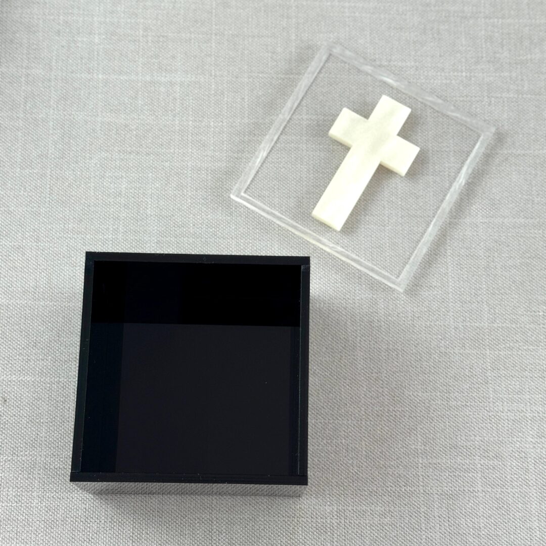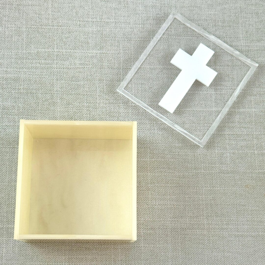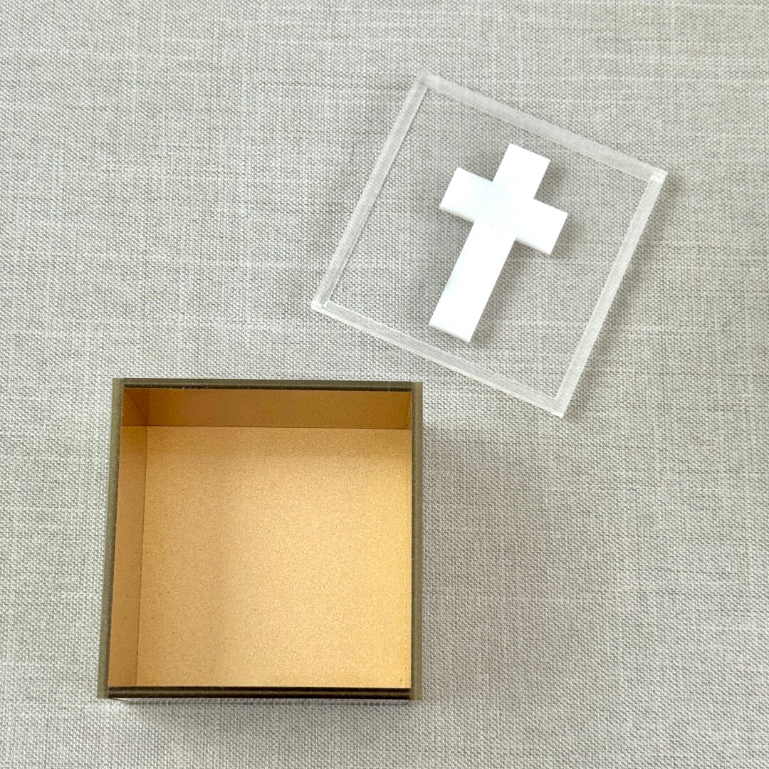 Cajita acrílica con cruz (8×8 cm)