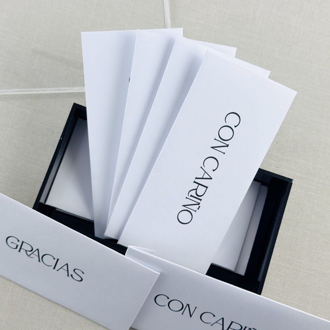 Caja negra con tapa transparente con medida de 18 x 9.5 cm, contiene 10 sobres combinados con mensaje de “Gracias” y “Con cariño”