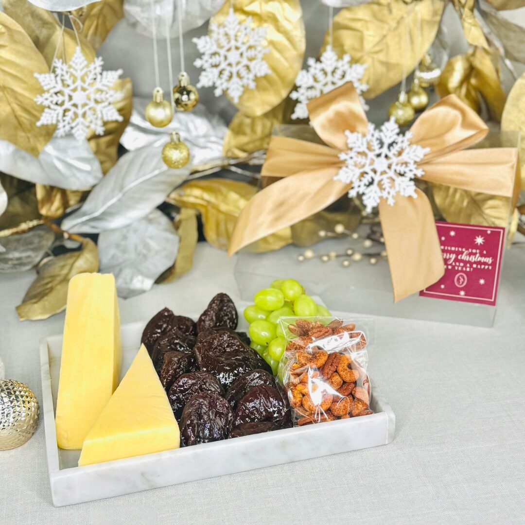 Charola de mármol/madera con selección de queso y duraznos Medidas: Charola de mármol de 28 x 22 cm Tabla de madera de 35 x 23 cm