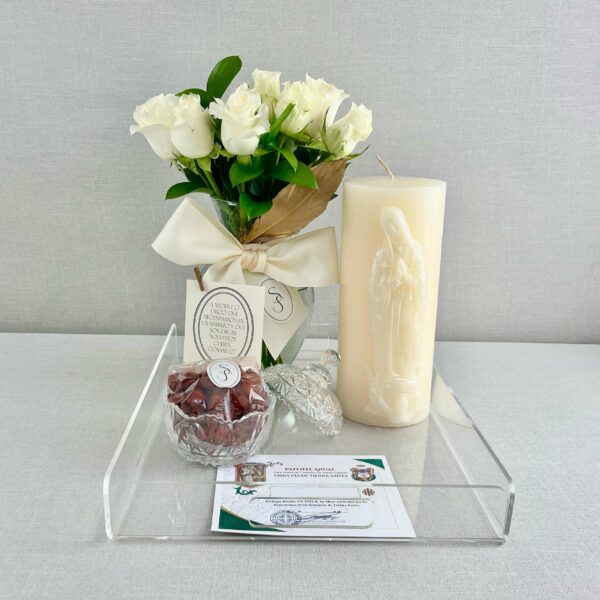 Florero con 12 rosas blancas Cirio de Virgen de Guadalupe marfil (25x10cm)