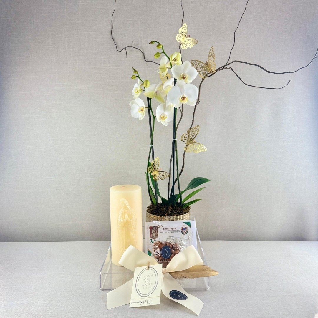 Orquídea doble grande blanca, decorada en un maceta de con curly y mariposas.